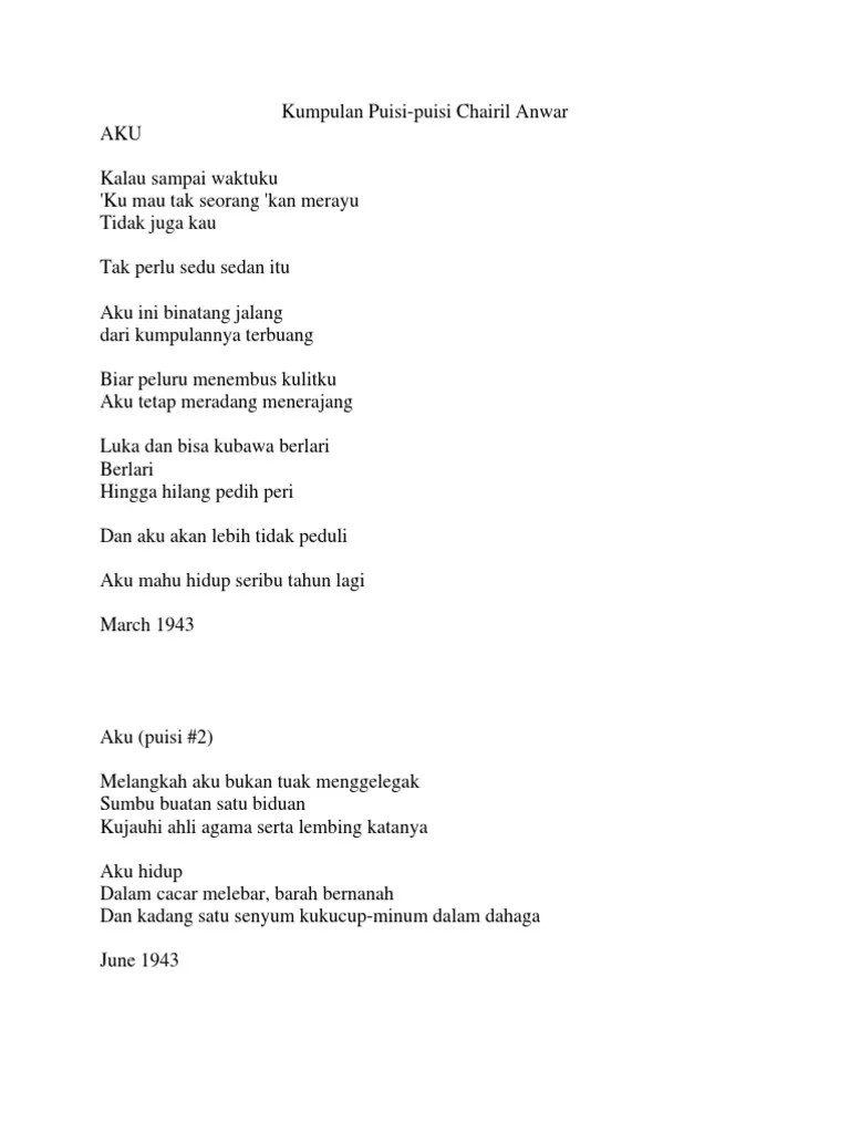 Kami yang kini terbaring antara krawang . Tetapi ia telah berhasil menuntaskan tugasnya sebagai pelopor penyair. Simak di bawah ini mengenai kumpulan puisi karya chairil anwar terbaru dan paling lengkap yang kami sajikan. Cintaku jauh di pulau · 4. Berikut ini adalah 10 puisi . Puisi aku karya chairil anwar yang ditulis pada tahun 1943,. Kalau sampai waktuku 'ku mau tak seorang 'kan merayu. Perjalanan kepenyairan chairil mungkin terlalu singkat. Kalau sampai waktuku · diponegoro. Chairil anwar terkenal sebagai penyair yang hidup dan matinya tidak dapat dilepaskan dari puisi indonesia modern sehingga ia menjadi pelopor angkatan 45 . Puisi maulid nabi muhammad s.a.w singkat · puisi pendek maulid nabi muhammad . 7 puisi cinta karya chairil anwar yang menyentuh hati · 1. Aku ini binatang jalang adalah kumpulan puisi terlengkap karya penyair terbesar indonesia chairil anwar.